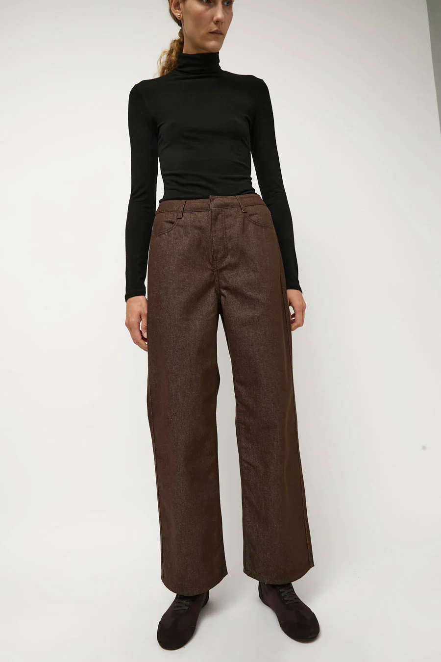 High rise jean with relaxed leg in brown. Classic 5 pocket construction and belt loops.