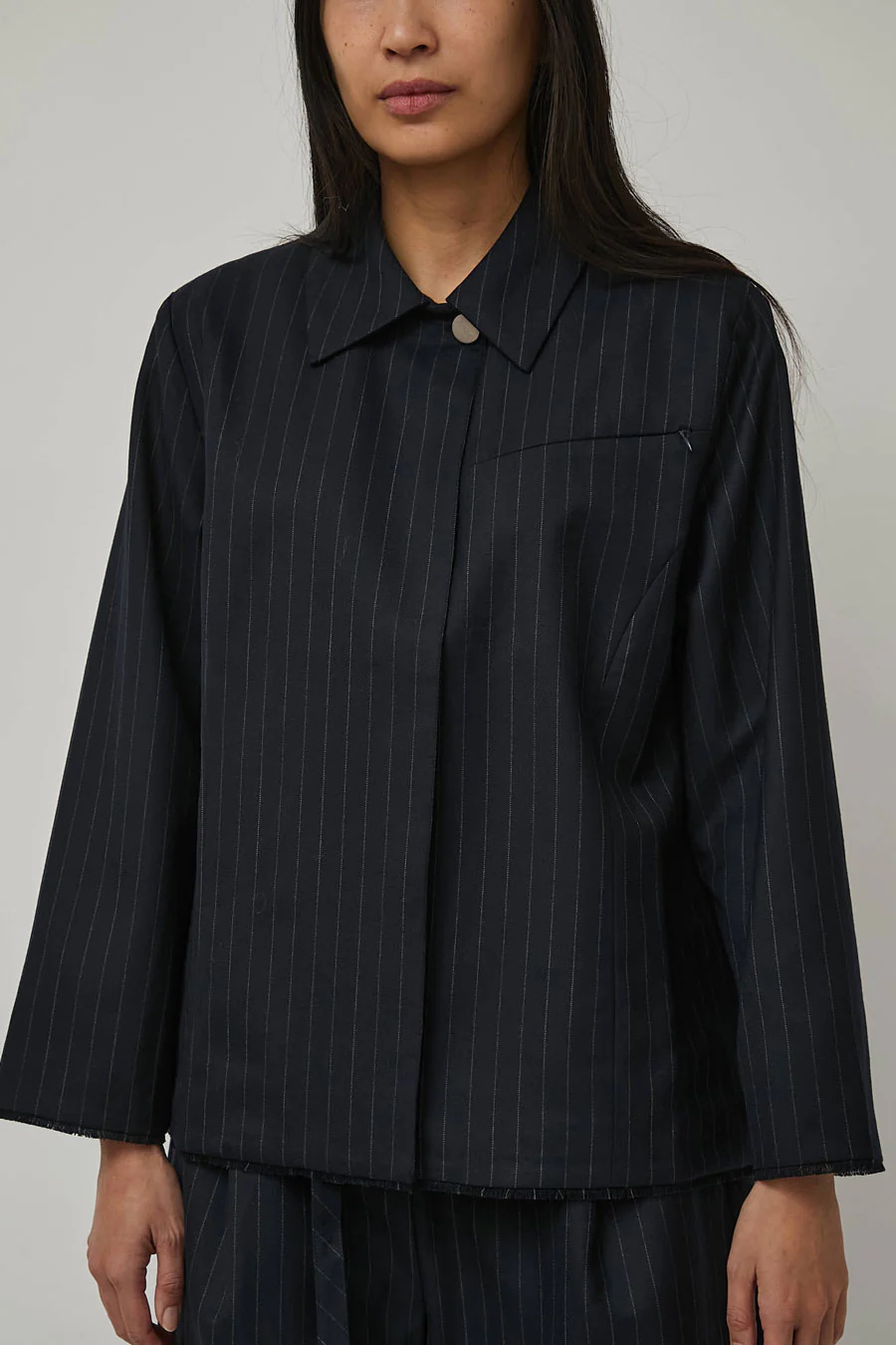 Inspired by deconstructed suiting. Wool blend pinstripe jacket with a concealed front zip closure and branded ARCS top button. Angled, zipped chest pocket and frayed edge detailing.