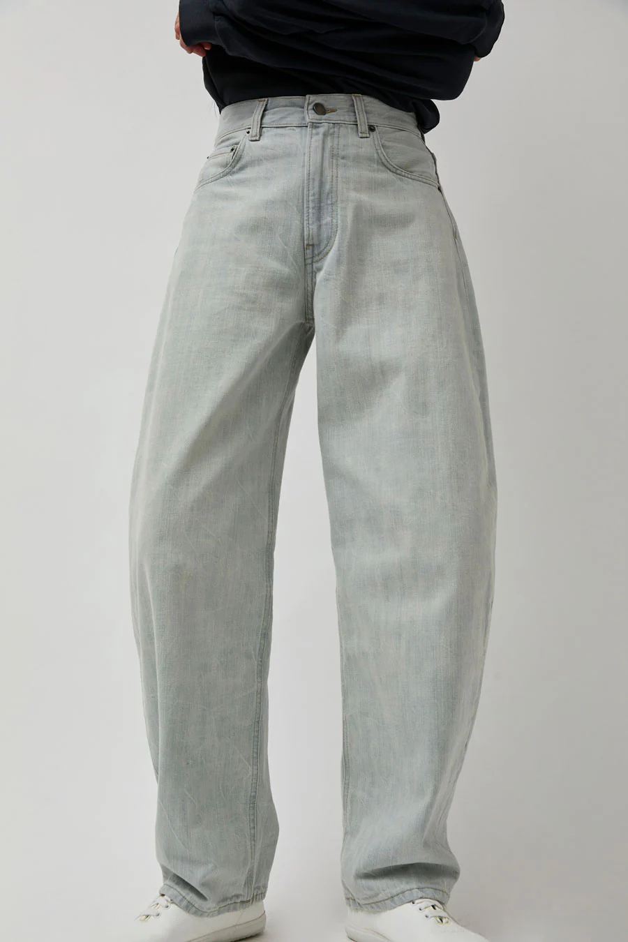 Relaxed barrel jean in light wash denim. Features belt loops and classic 5 pocket construction.