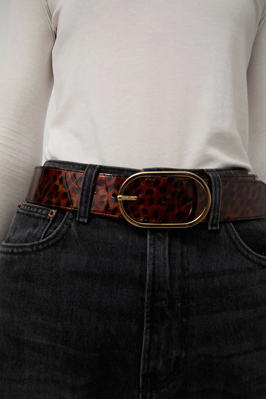 Printed leather belt with a minimal metallic buckle. Effortlessly throw on to dress up your everyday wear.