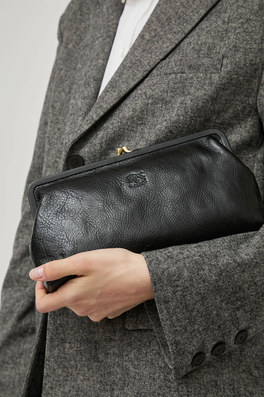 Vegetable-tanned cowhide leather clutch with retro snap closure. Cotton canvas lined.