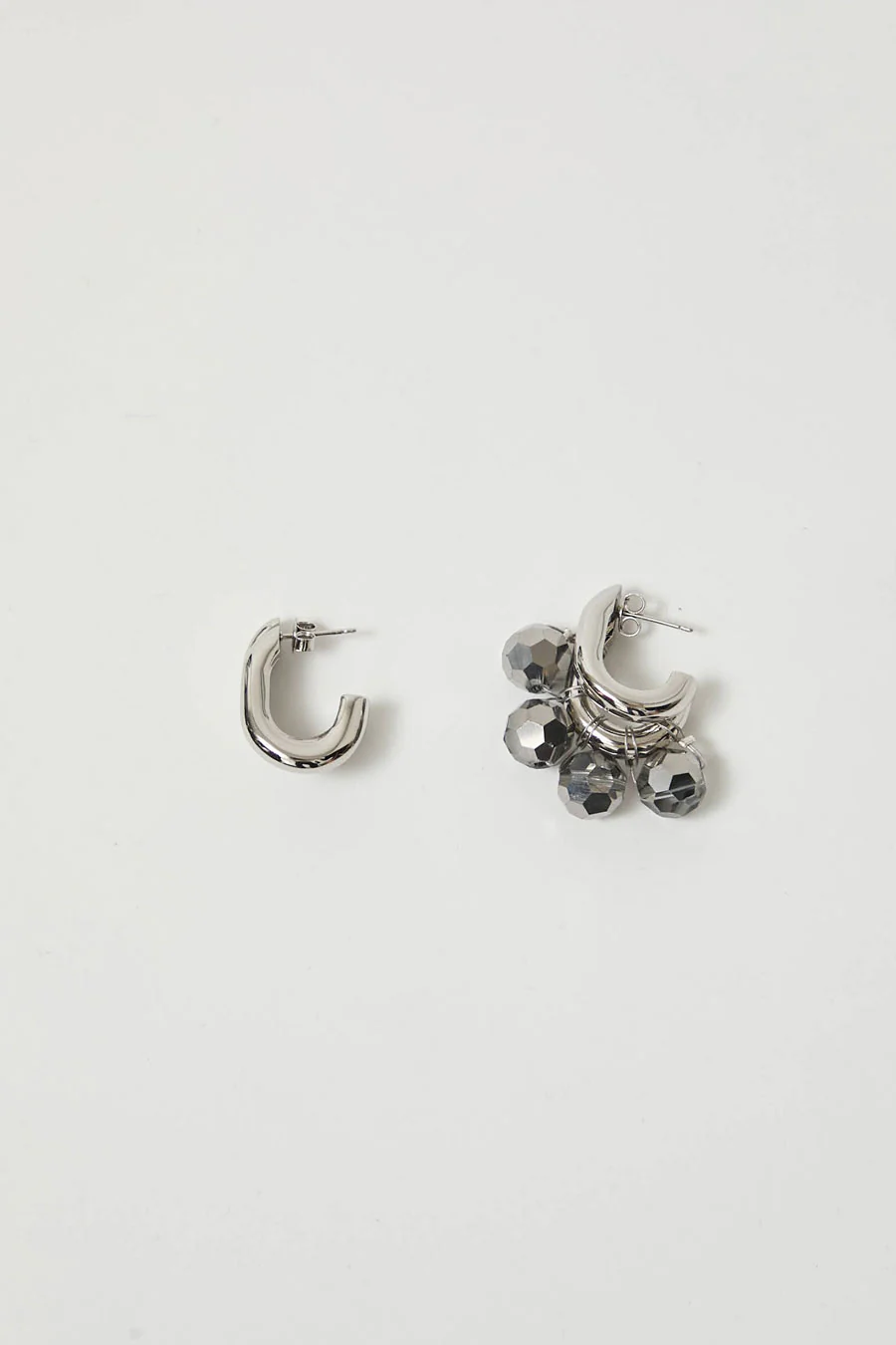 Pair of silvered brass hoop earrings, asymmetrically adorned with crystal beads.