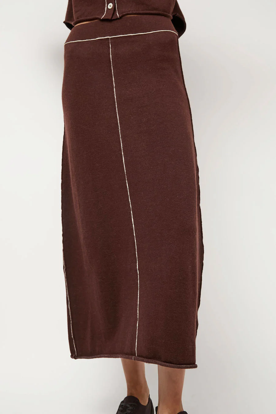 Alapaca and merino blend knit maxi skirt. Soft and structured with a nice amount of stretch. Features contrast stitching and rolled hem.