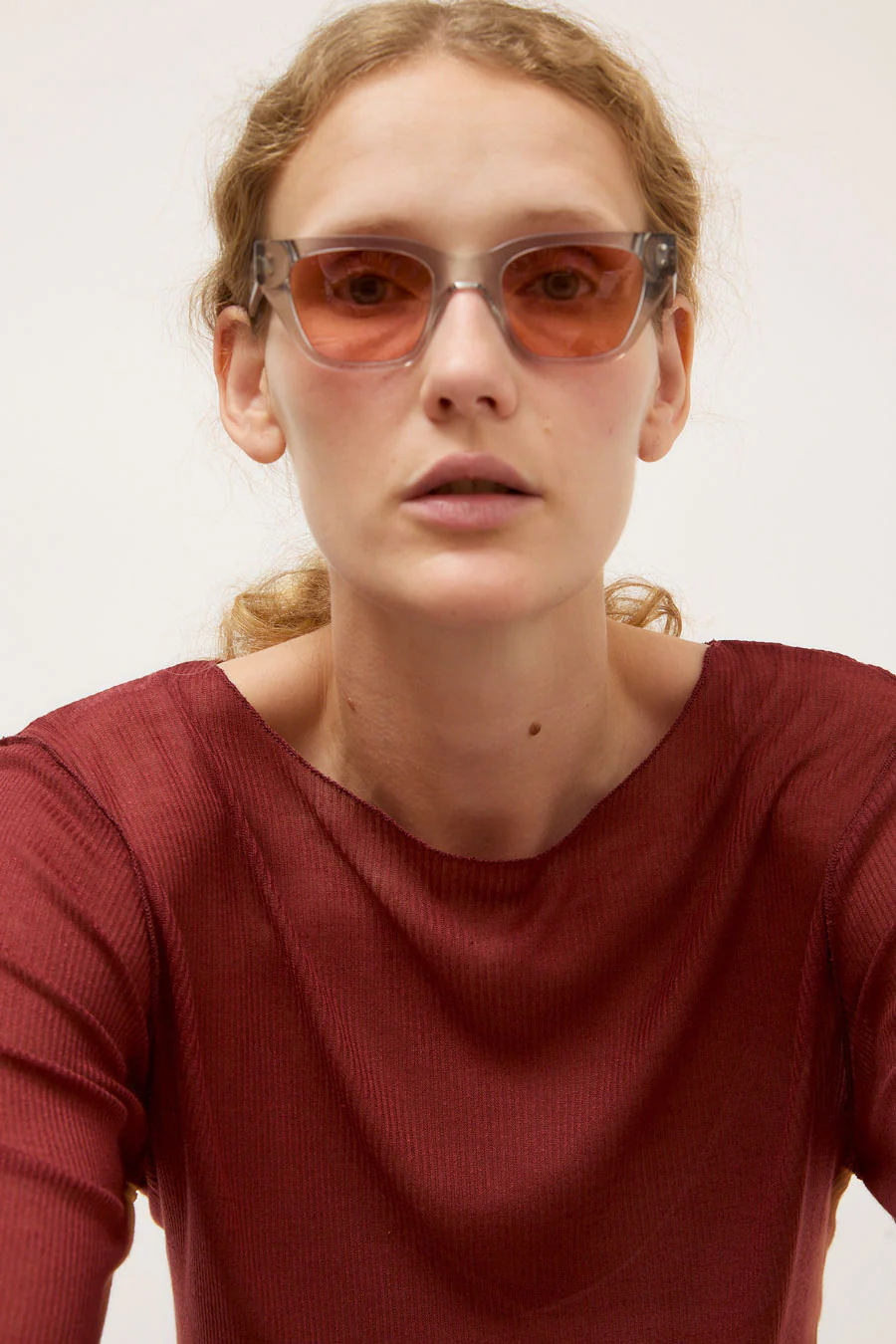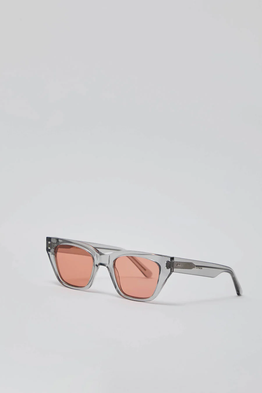 Bold orange-tinted sunglasses set in a transparent grey acetate frame. Classic shape with a touch of drama. Hand-crafted with anti-scratch and anti-reflective lenses. 100% UVA/UVB protection.