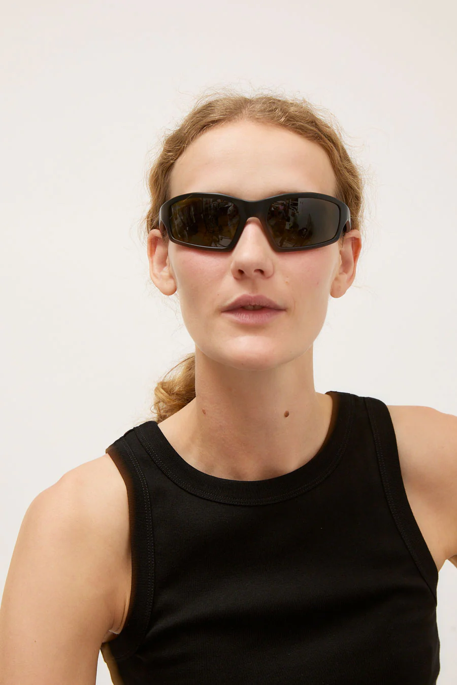 Sporty green-tinted sunglasses in a matte black acetate frame. Hand-crafted with anti-scratch and anti-reflective lenses. 100% UVA/UVB protection.