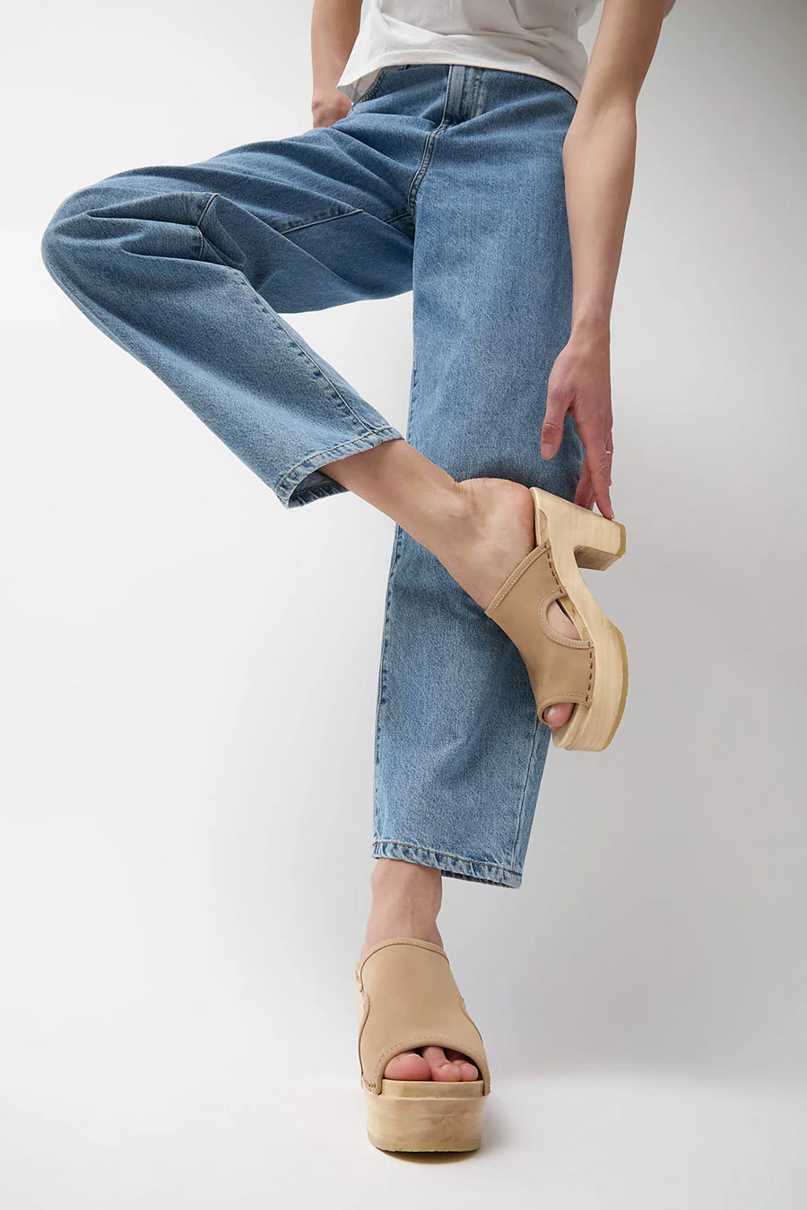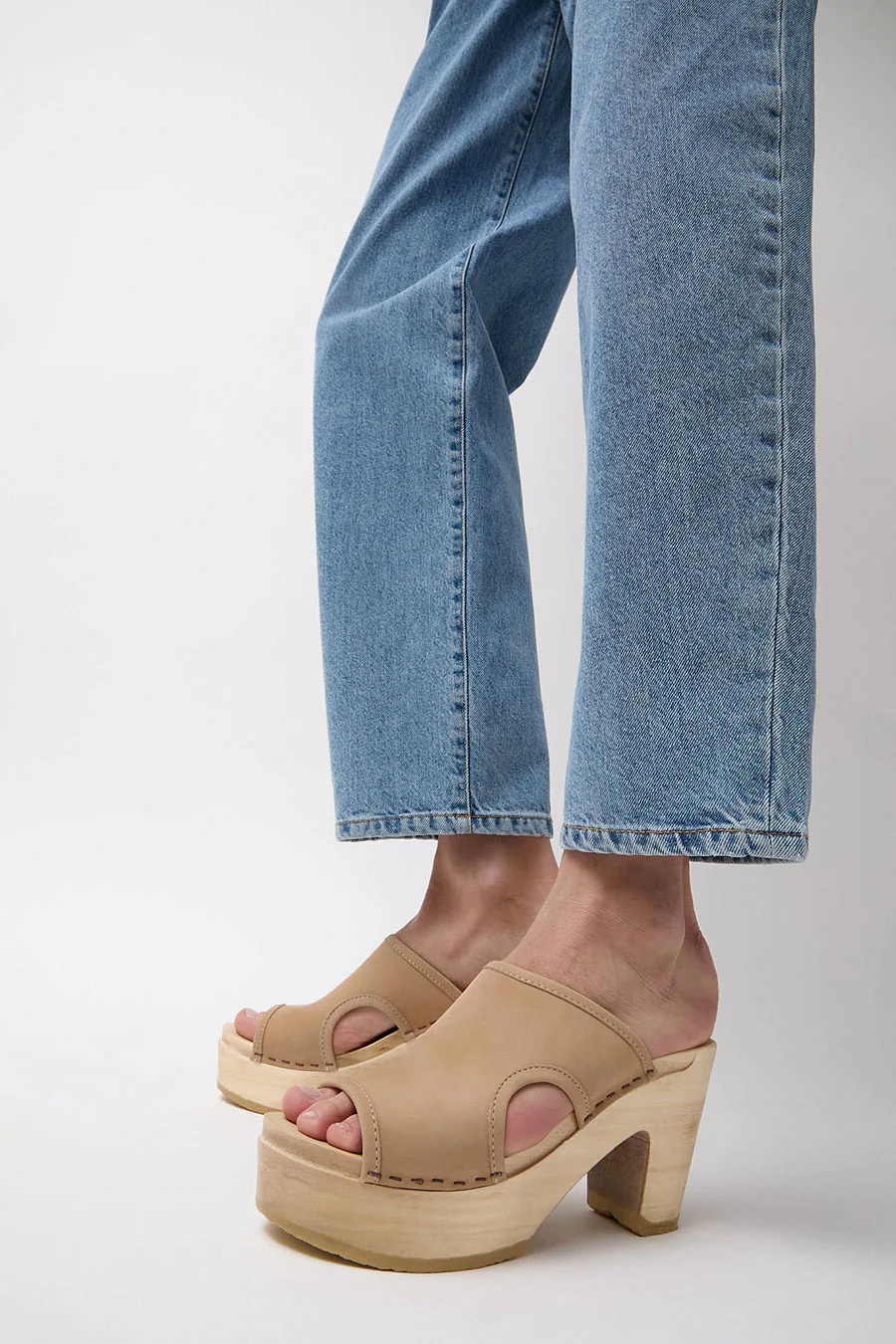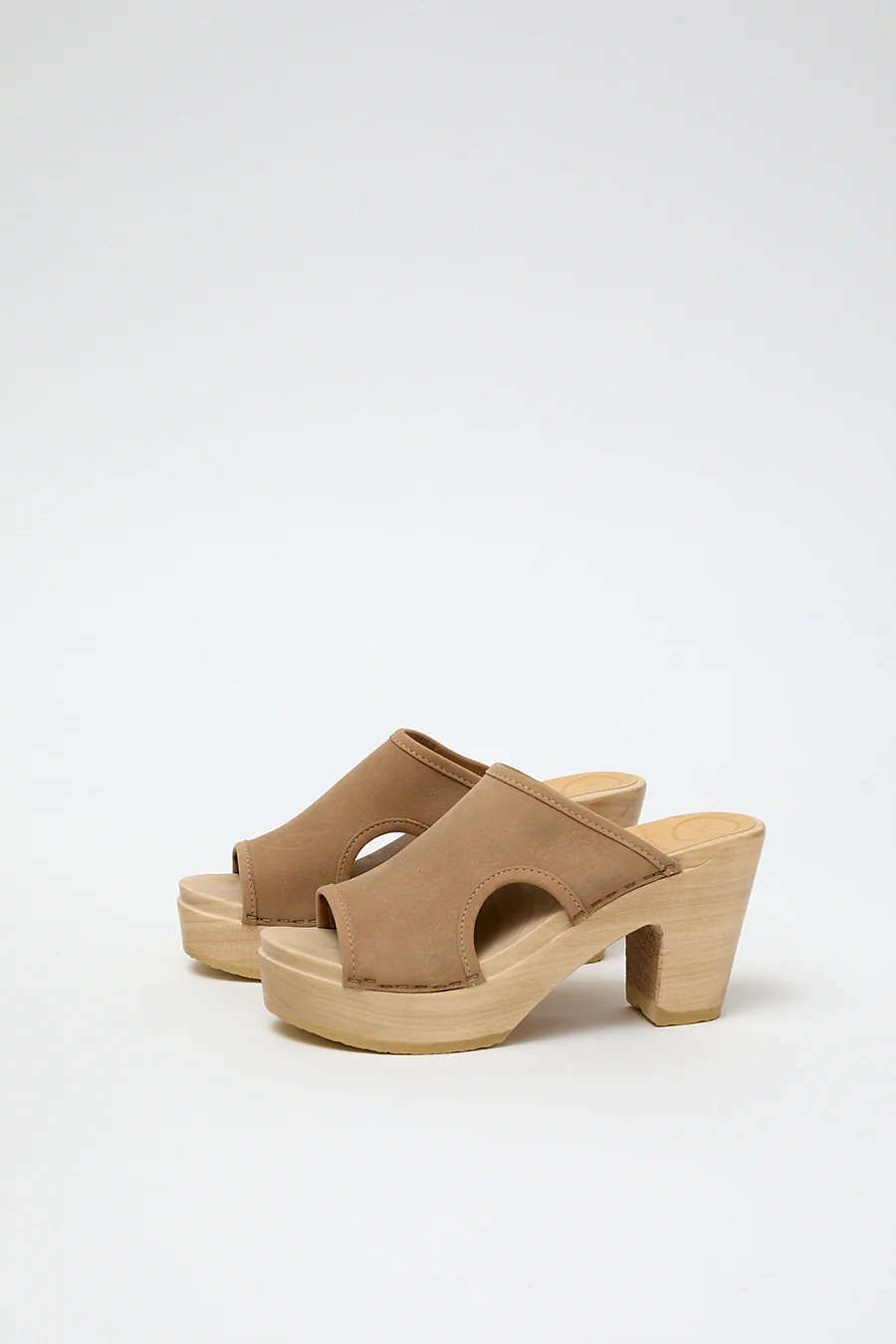 Open toe clog slide on platform heel. Smooth, pale beige nubuck upper. Side cut outs and double-needle stitching. Lacquered, lightweight wood base. Unlined.