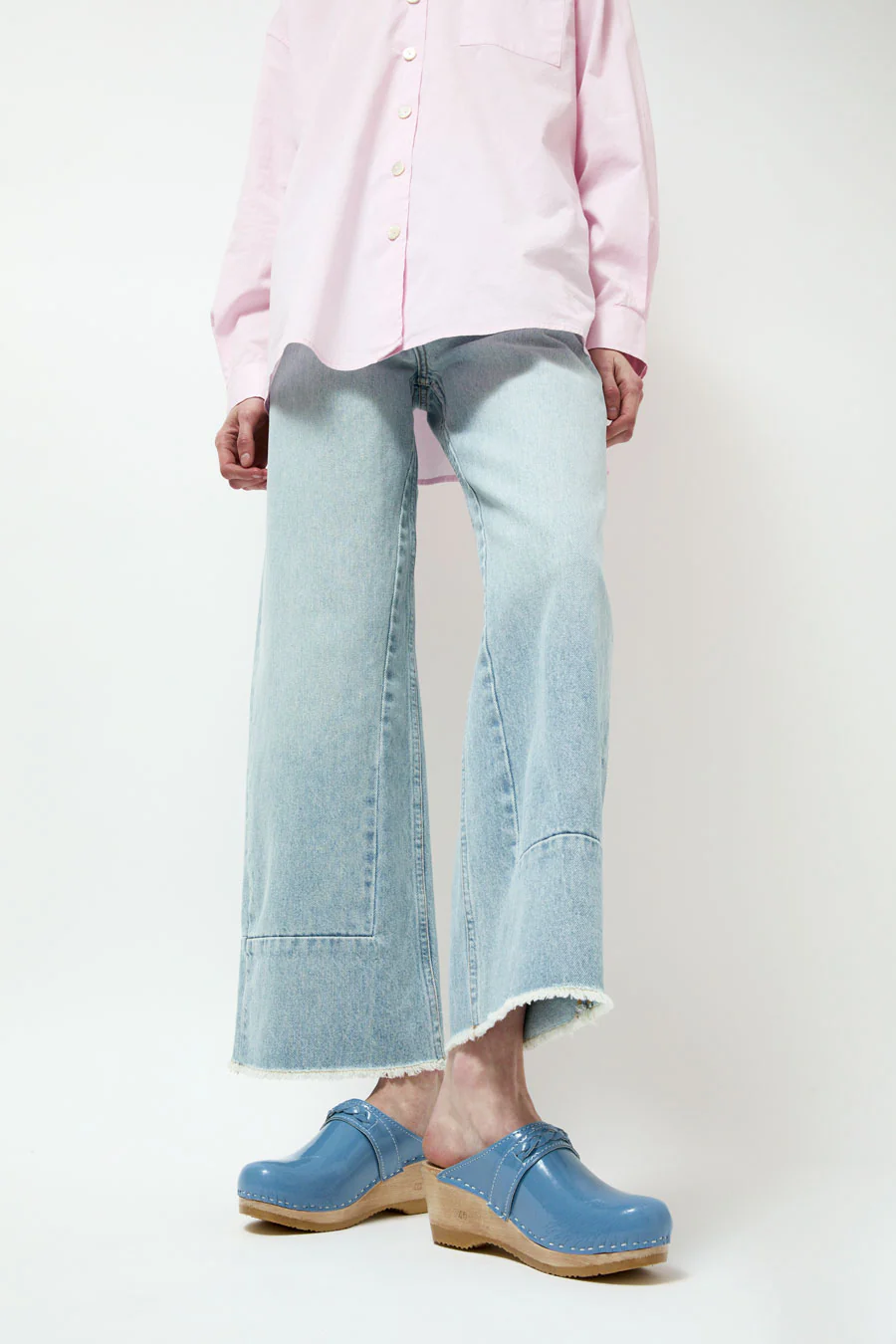 Slip on, closed-toe clog with braided band detail on a comfy mid-wedge base. Mid blue patent leather upper. Stitched collar, slightly rounded toe and open back. Lacquered, lightweight wooden base.