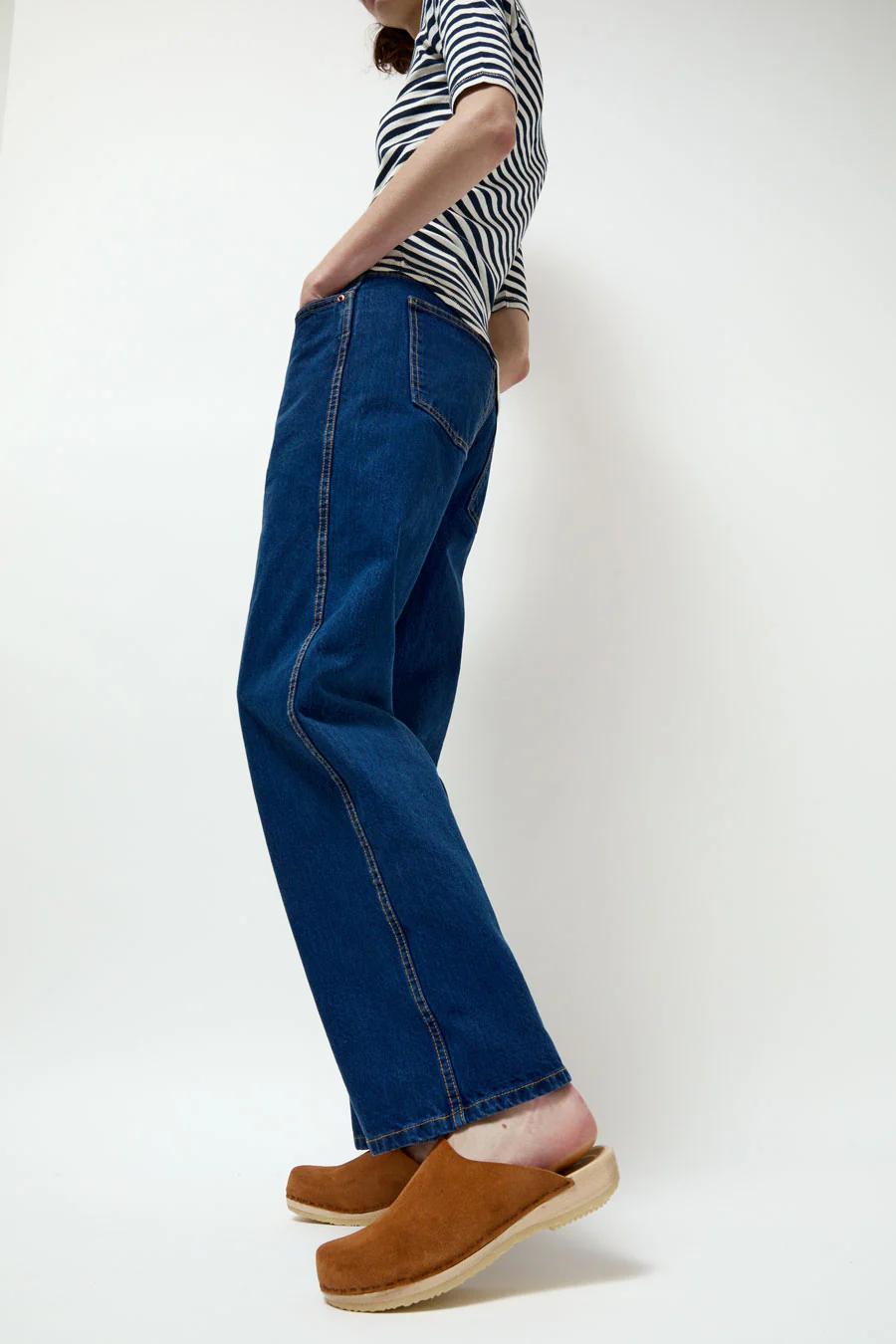 A No.6 favorite. Chic, modern, perfect for outdoor and indoor, socks or no socks. Clean lines, flat base, perfect all year round. Warm brown suede upper. Lacquered, lightweight wood base.