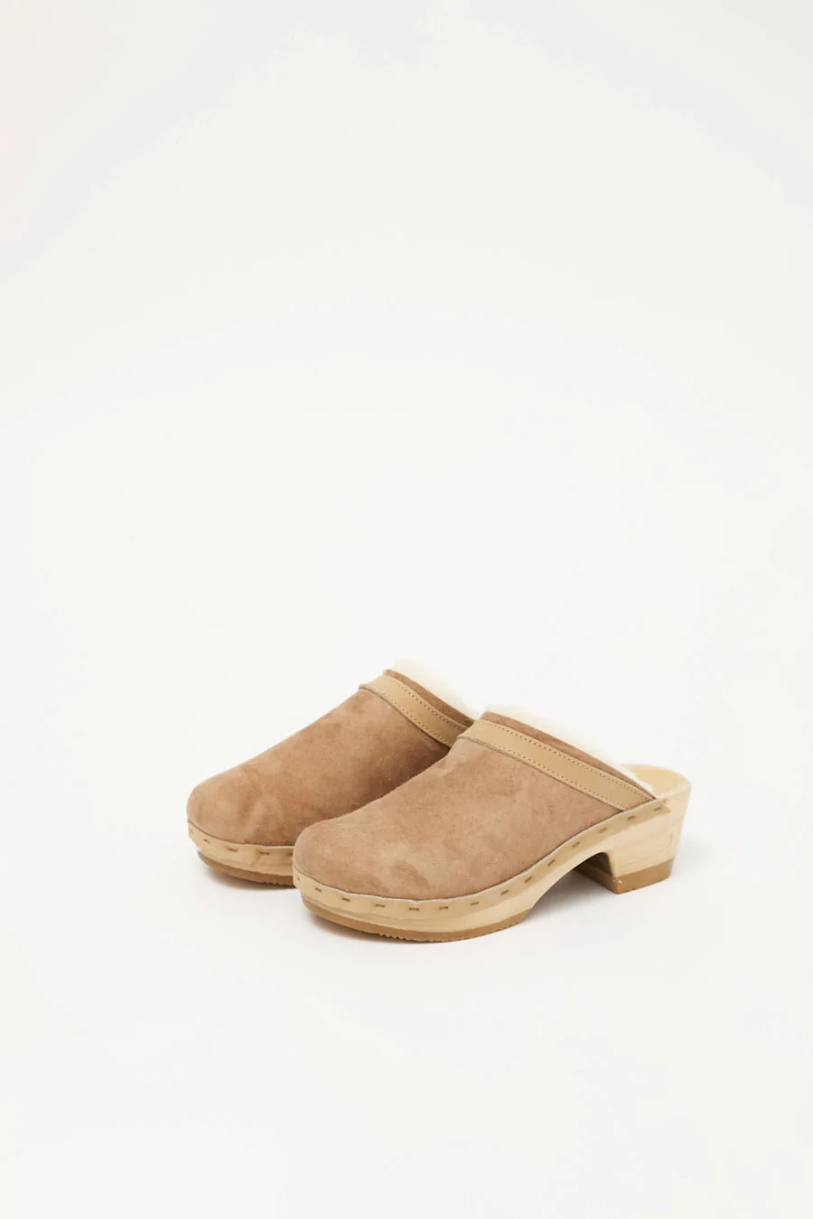 Slipper meet clog, clog meet slipper. Mid heel clog with sheepskin upper. Perfect for when the weather starts to get cold. We love this for indoors and outdoors. Fawn suede is a light tan suede with off-white shearling. Please note: This style has a low instep, initial fit may be snug. Upper will stretch and give with wear.