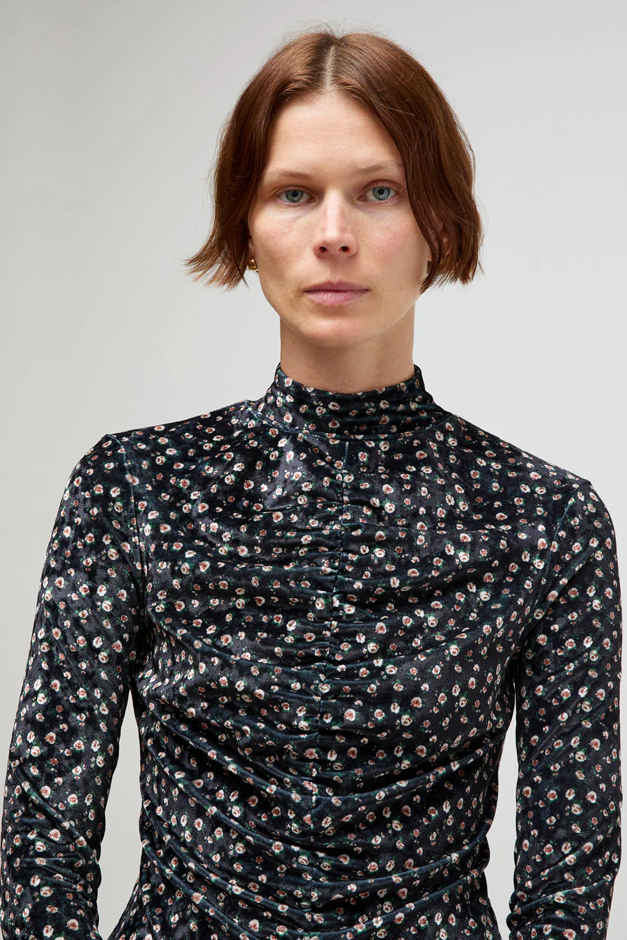 Long sleeve fitted floral turtleneck with flattering ruched center seam. Hem long enough to tuck.