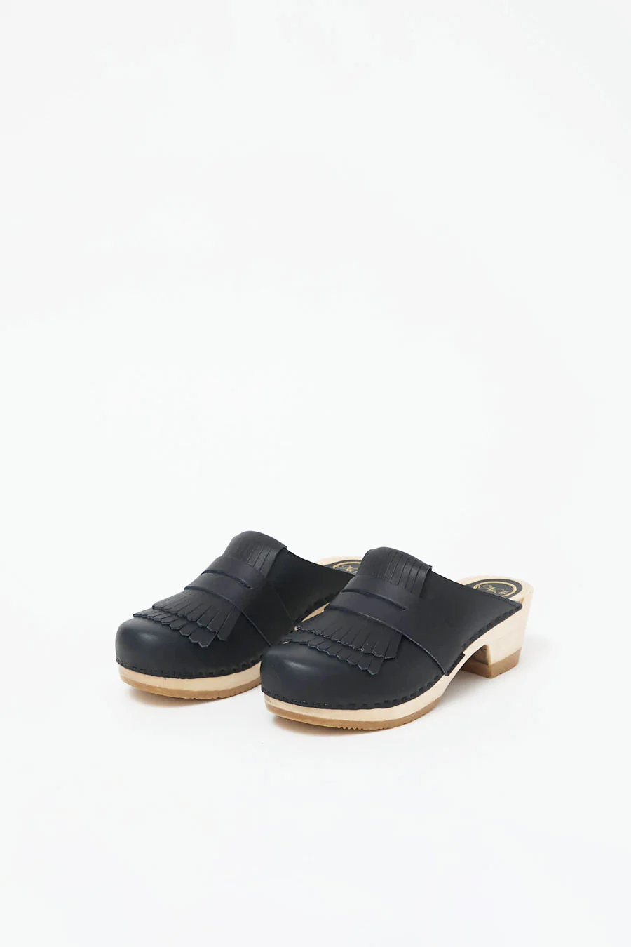 When loafers and clogs fall in love... Classic slip on clog with penny loafer and kiltie details on our best selling mid heel base. Lacquered, lightweight wooden base.