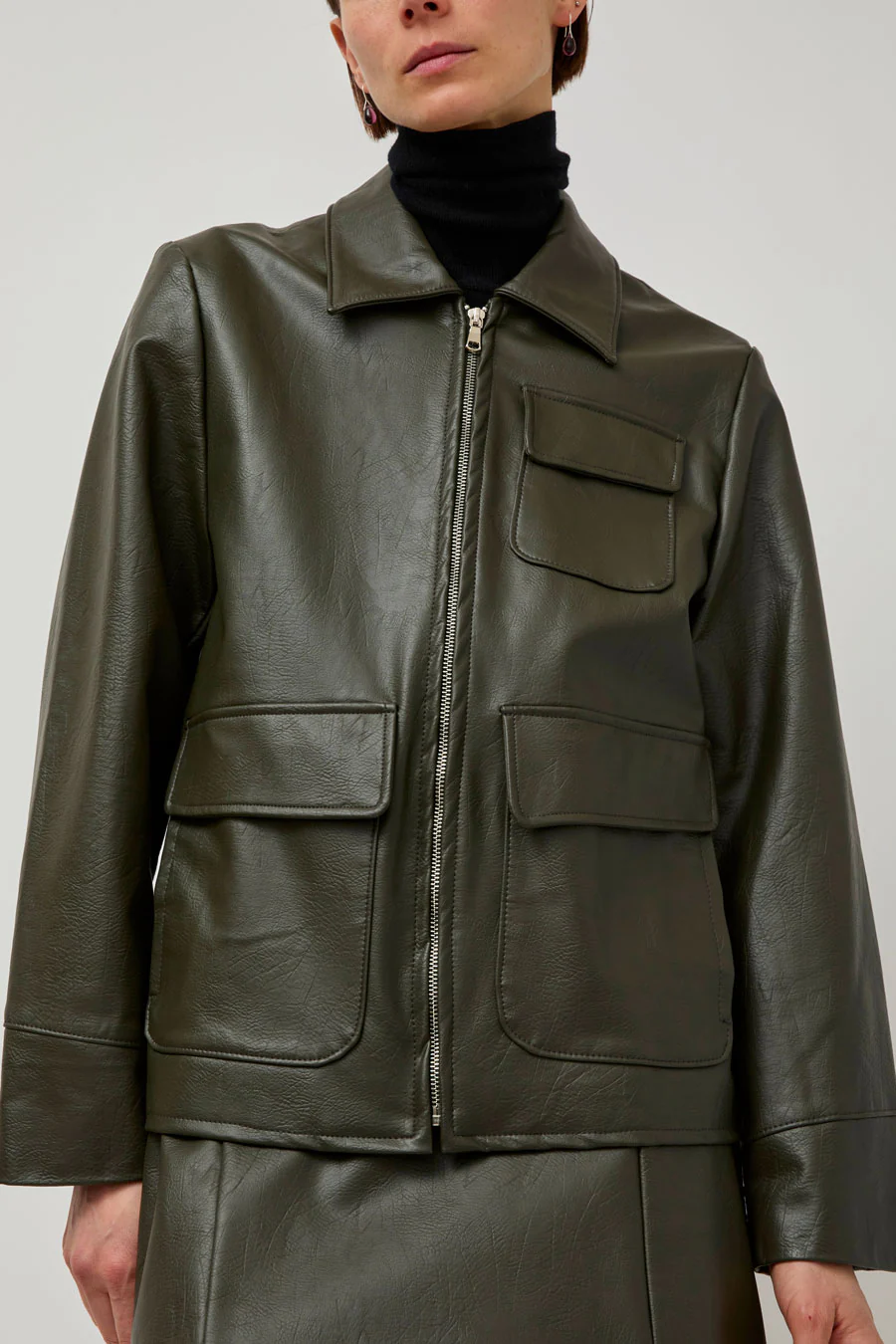 Fully lined vegan leather jacket with pointed collar and front zip closure. Features front flap pockets and streamlined seam detail on sleeve and back panel. For the full look, wear with the No.6 Jess Skirt in Green.