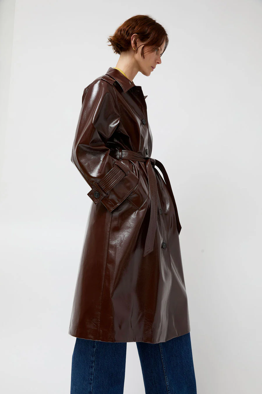 70s inflected trench cut in vegan leather. Bold details throughout. Wide collar and cuff, waist tie. Statement-making yet wearable.