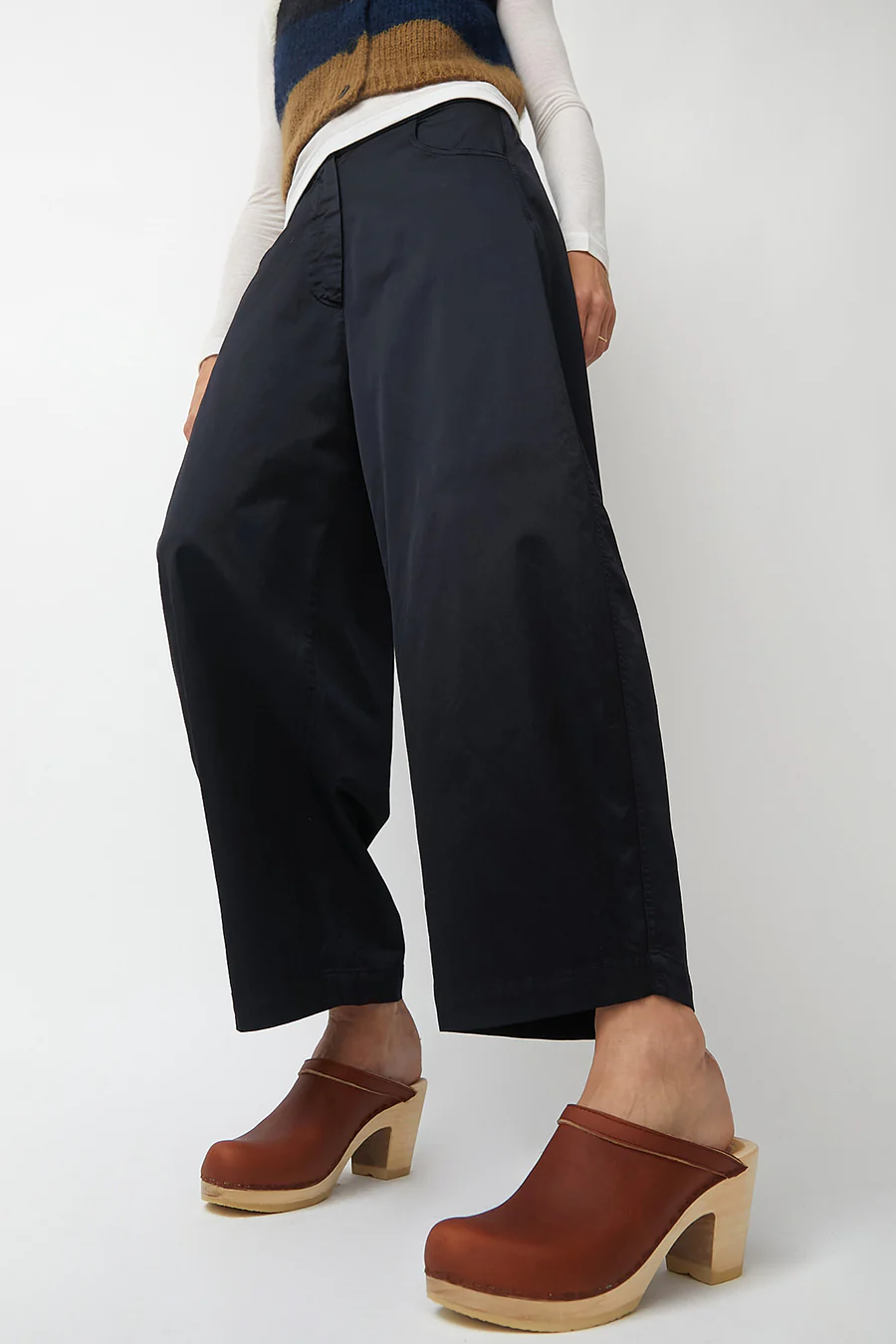 Classic closed toe clog on high heel base. Reddish-brown leather upper. Rounded toe and open back. Lightweight, lacquered wood base. Surprisingly comfortable for a high heeled shoe. Unlined.