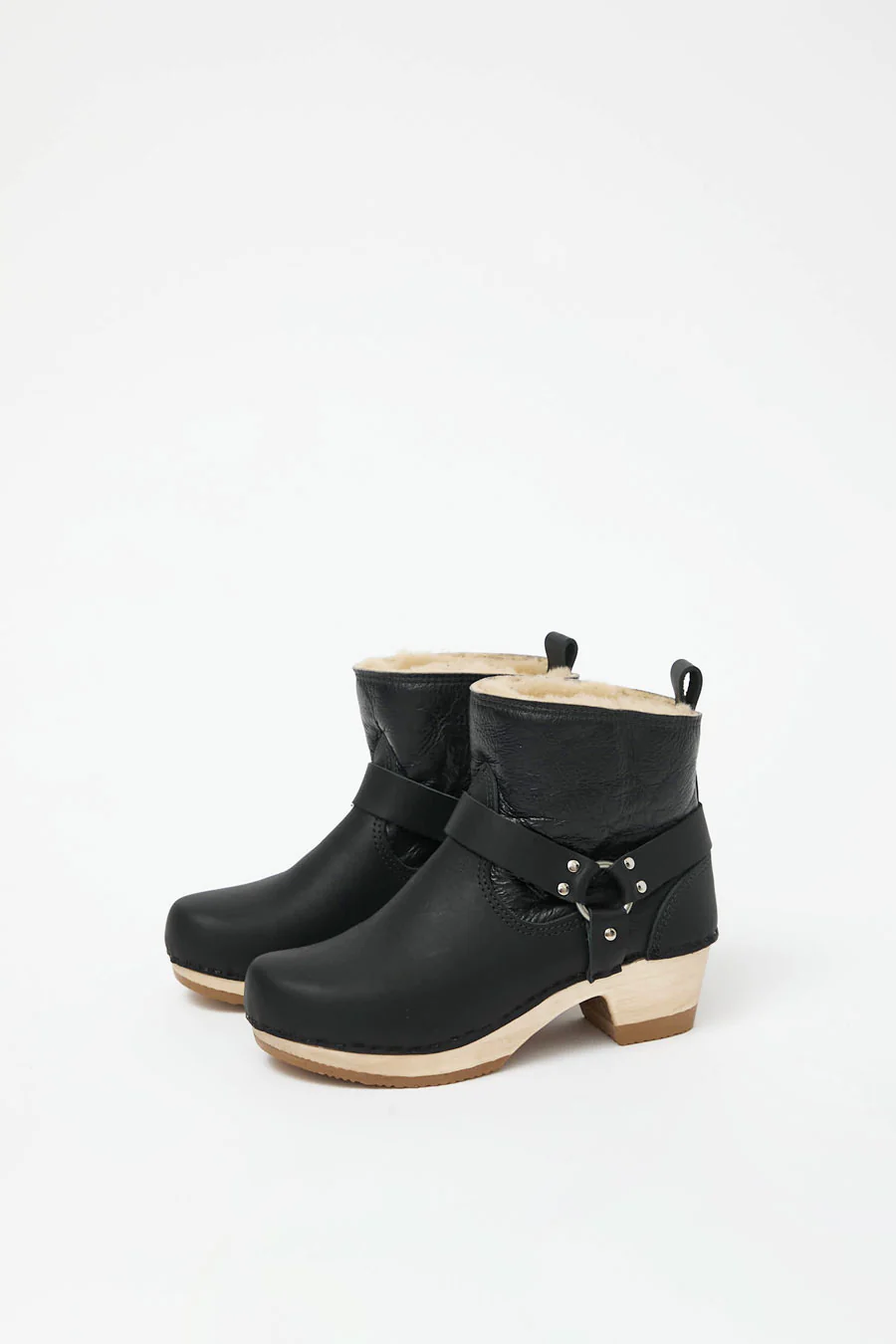 Fully lined shearling boot with leather toe, heel cap, and back tab. 5” tall shaft. Mid-heel base. Motorcycle style classic silver ring harness detail.