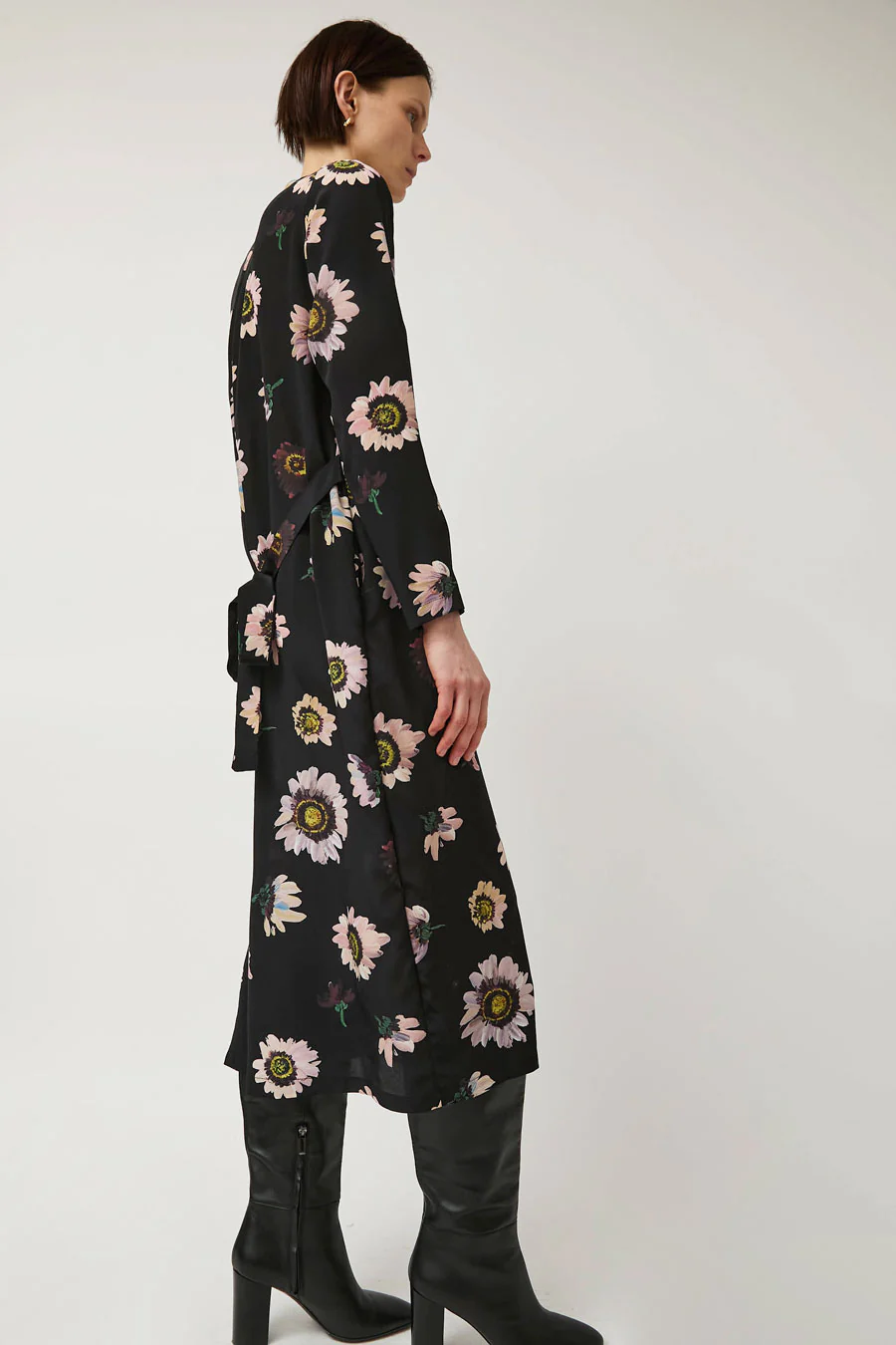 Long sleeve shift dress with boat neckline, back zip closure, and single back slit. Falls to the shin. Features belt tie that can be worn in front or back. Made in NYC.