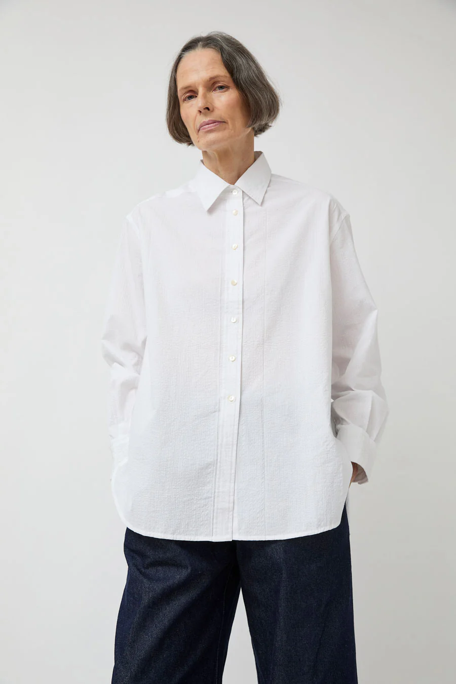 An innovative take on a classic white poplin shirt. Prior to making the garment, the fabric is folded and stitched. The stitches are then removed, revealing a perforated texture. Features box pleat detail at the back, shirt tail, and accentuated side gusset.