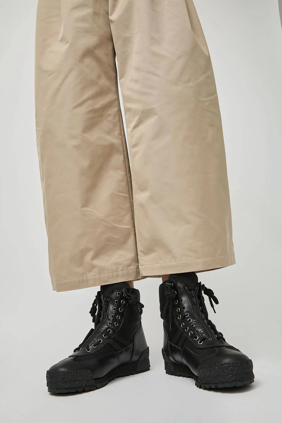 Lace up high top sneaker meets boot with leather and nylon upper and rubber sole. Modeled after vintage military wear.
