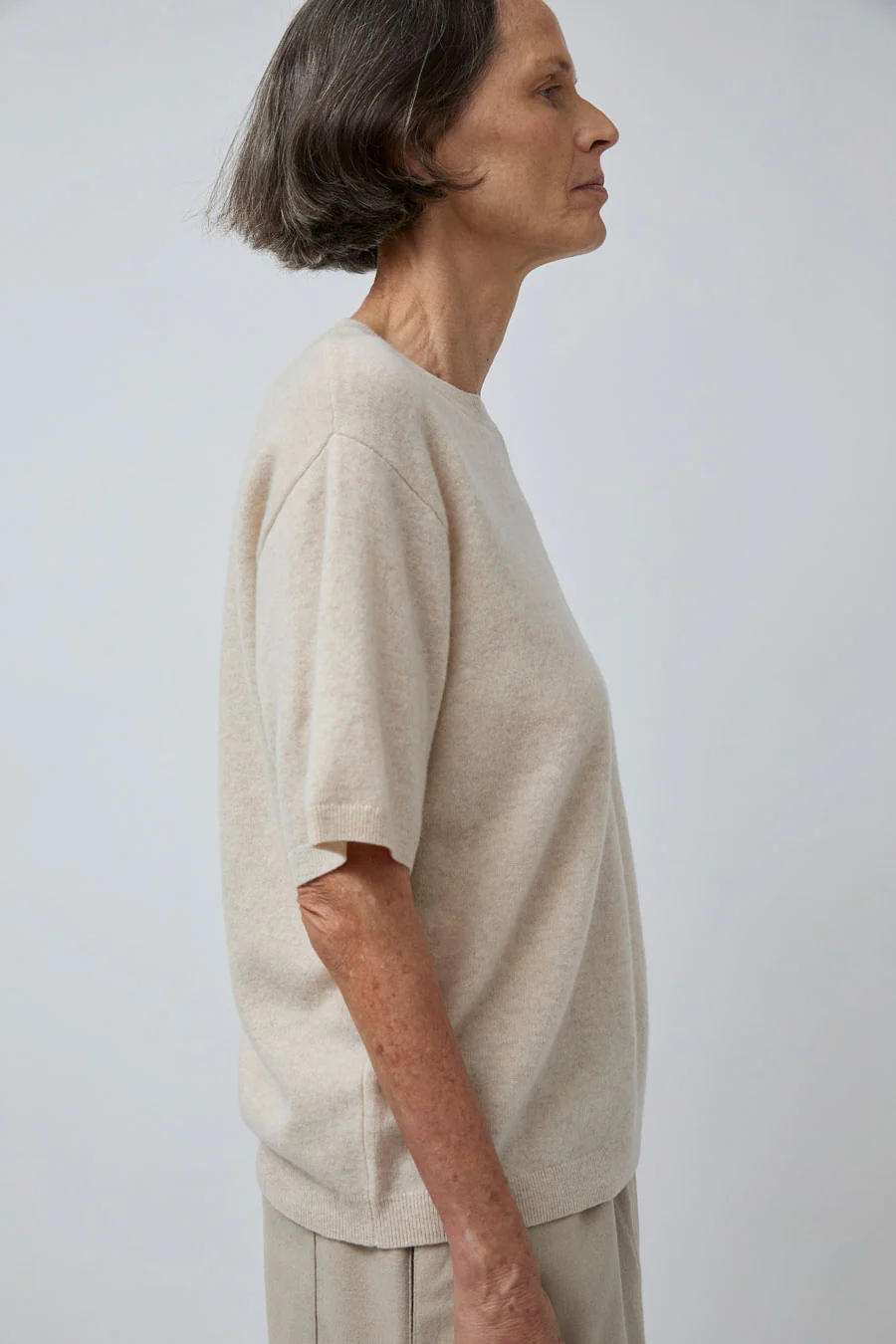 A short-sleeved sweater crafted from extrafine merino wool in soft, mélange cream. Its boxy fit, round neckline, and dropped shoulders create a T-shirt silhouette, offering versatile style and cozy softness.