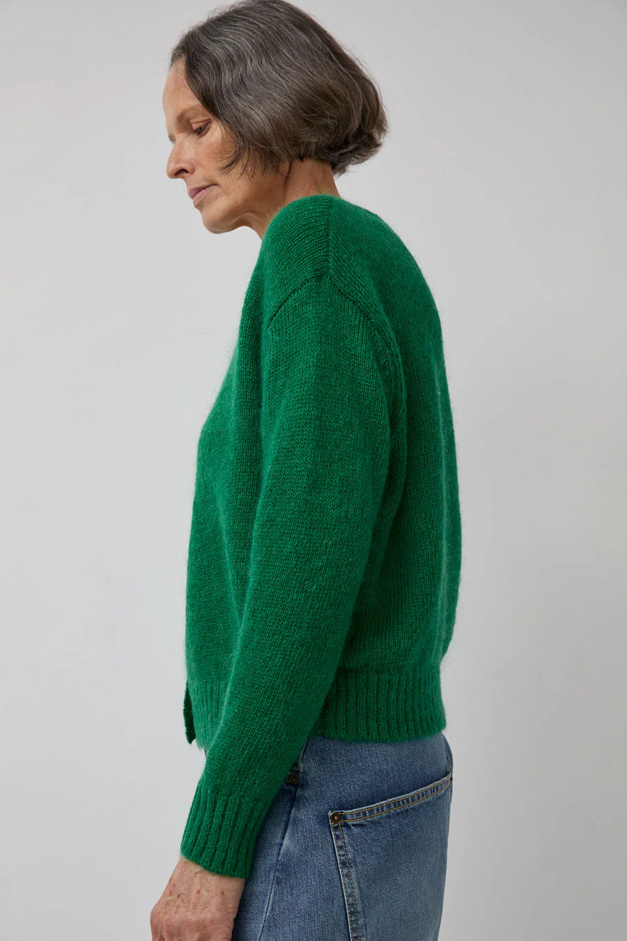 Relaxed knit cardigan with round neckline, dropped shoulders, and generously sized buttons. Chunky ribbed trims and a subtly fitted waistband add gentle structure to the airy mohair blend. A confident layer with impact.