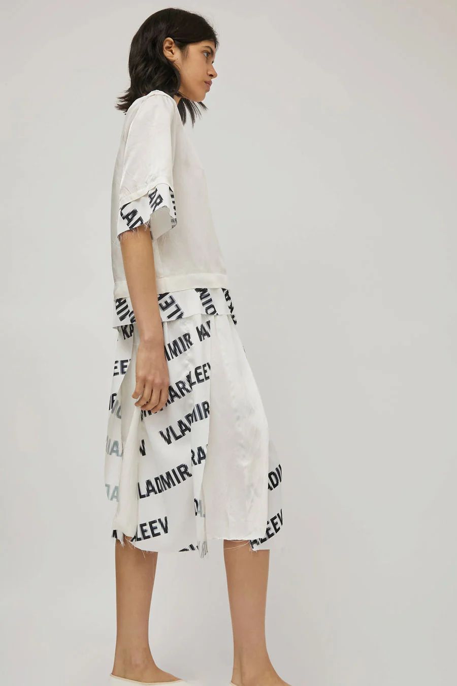Mid-length a-line panel skirt with a raw hem featuring the Vladimir Karaleev logo print. Easy, lightweight fit and feel with an elasticated waistband. For the full look, wear with the Vladimir Karaleev Layer Tee in Logo Print.