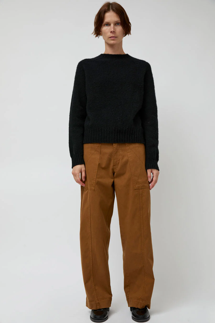 Relaxed leg high-waist trousers. Round, shaped legs with front seam detail and patch pockets with cross stitch accent. Single back welt pocket and belt loops.